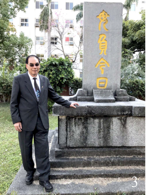 黃丁風律師在母校台中一中「毋負今日」紀念碑 ( 創辦人林獻堂勒石銘刻 ) 留影。